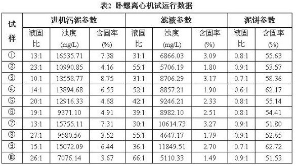 試運(yùn)行期間,進(jìn)機(jī)污泥參數(shù)變化不大,離心機(jī)各項(xiàng)參數(shù)基本保持為:污泥流量20m3/h、差速8r/min、轉(zhuǎn)速1800r/min、主機(jī)電流30A。試運(yùn)行數(shù)據(jù)見表2。