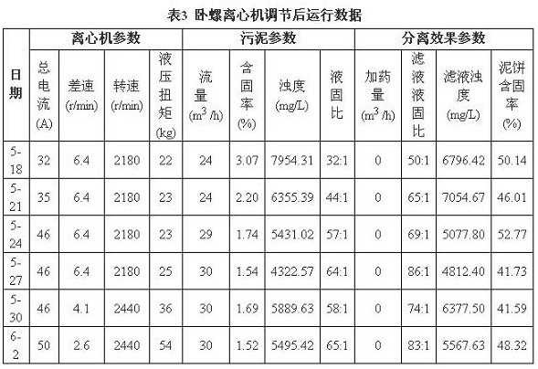 在參數(shù)的摸索調(diào)節(jié)中,轉(zhuǎn)鼓轉(zhuǎn)速過大會(huì)造成離心機(jī)本體的磨損和增加動(dòng)力消耗,轉(zhuǎn)速過小,達(dá)不到處理效果,在前期運(yùn)行轉(zhuǎn)速1800r/min的情況下,適當(dāng)調(diào)節(jié)到2100~2500r/min范圍內(nèi);同時(shí)結(jié)合污泥含固率的減少和物料的難分離特性,將差速由前期的8r/min降低到2.5~6r/min范圍內(nèi),延長(zhǎng)固體顆粒在離心機(jī)內(nèi)的停留時(shí)間。調(diào)節(jié)后運(yùn)行數(shù)據(jù)見表3(選擇上午8時(shí)數(shù)據(jù))。