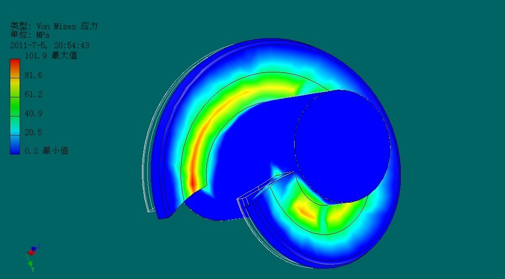 下面我們通過(guò)對(duì)螺旋葉片施加一定的載荷,來(lái)反映在工作狀態(tài)下螺旋葉片最大應(yīng)力和變形發(fā)生的位置。下面我們從ANSYS有限元分析的結(jié)論圖中選定:Von Mises 應(yīng)力(Von Mises 應(yīng)力是基于剪切應(yīng)變能的一種等效應(yīng)力,其含義是單元體形狀比能達(dá)到一定的程度)和X方向上的位移這兩幅分析圖,既可以清楚反映葉片的根部應(yīng)力值最大的問(wèn)題,同時(shí)從位移圖中可以看出葉片外端部所受的位移變化之最大。