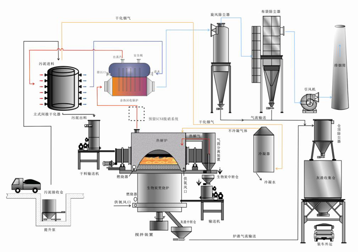 3、污泥進(jìn)入熱解爐進(jìn)行熱解,熱解后生物炭進(jìn)入生物炭焚燒爐提取可用熱量,混合氣進(jìn)入熱解爐膛燃燒,從熱解爐引來的燃燒后熱煙氣進(jìn)入余熱回收裝置,產(chǎn)生蒸汽迅速返回至間接干化器夾層,通過間接加熱對污泥進(jìn)行干化,干化后蒸汽變?yōu)闊崴赜?,引風(fēng)機(jī)抽出的煙氣經(jīng)尾氣處理系統(tǒng)清潔凈化后,達(dá)標(biāo)排放;