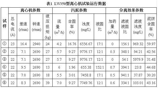 2010年10月底,公司選用麗水市恒力離心機(jī)械設(shè)備有限公司的LW350A型臥螺離心機(jī)對(duì)循環(huán)水污泥進(jìn)行了定性試驗(yàn),LW350A型離心機(jī)的主要參數(shù)為:螺旋差速10~30r/min、轉(zhuǎn)鼓轉(zhuǎn)速2800r/min、電機(jī)功率55kW。絮凝劑選用濃度為1.5‰的陰離子型聚丙烯酰胺,試驗(yàn)數(shù)據(jù)見表1。