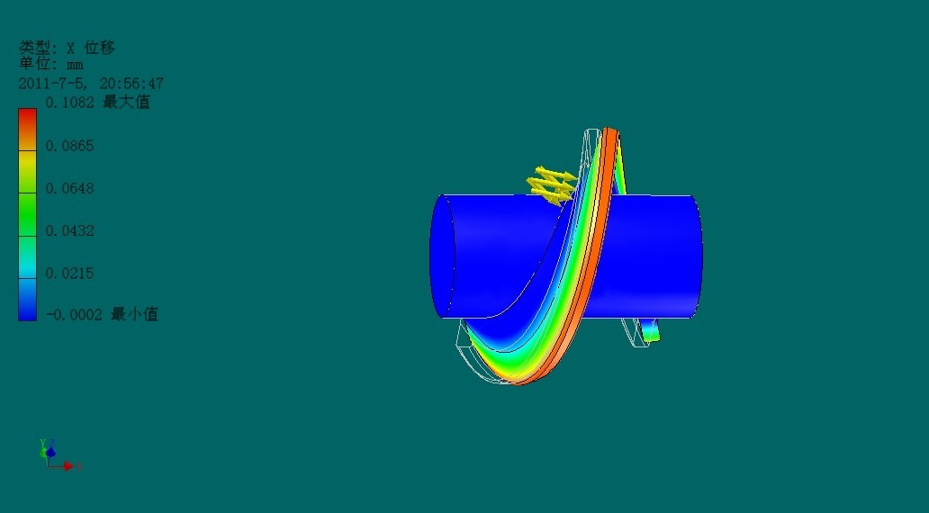 下面我們通過(guò)對(duì)螺旋葉片施加一定的載荷,來(lái)反映在工作狀態(tài)下螺旋葉片最大應(yīng)力和變形發(fā)生的位置。下面我們從ANSYS有限元分析的結(jié)論圖中選定:Von Mises 應(yīng)力(Von Mises 應(yīng)力是基于剪切應(yīng)變能的一種等效應(yīng)力,其含義是單元體形狀比能達(dá)到一定的程度)和X方向上的位移這兩幅分析圖,既可以清楚反映葉片的根部應(yīng)力值最大的問(wèn)題,同時(shí)從位移圖中可以看出葉片外端部所受的位移變化之最大。