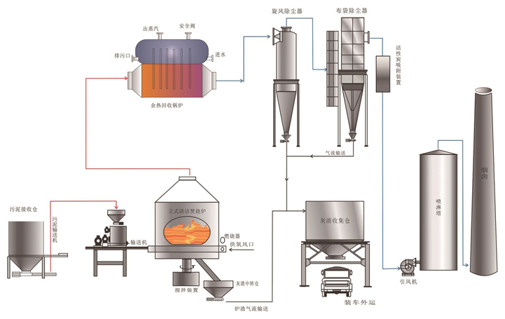 2.儲存?zhèn)}里的污泥通過輸送機均勻定量的將污泥送入立式清潔焚燒爐進行焚燒處理,焚燒后形成的炭化物在燃燒過程中逐漸向立式清潔焚燒爐中心移動,徹底完成焚燒的灰渣經由多孔管吹出的空氣得到冷卻,最終從處于中心部位的灰渣排出口排出;